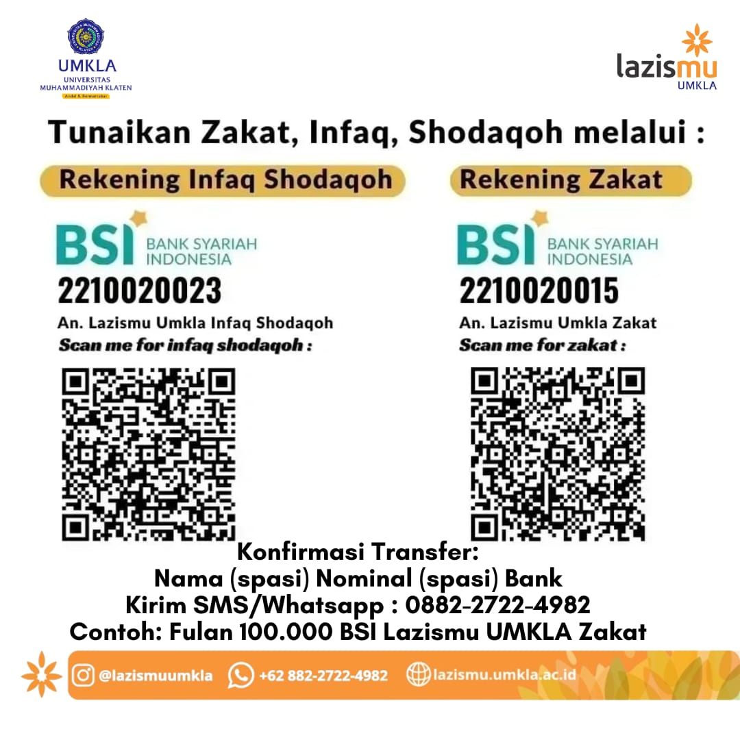 • Rekening Infaq dan Shodaqoh BSI : 2210020023 An. Lazismu UMKLA Infaq Shodaqoh